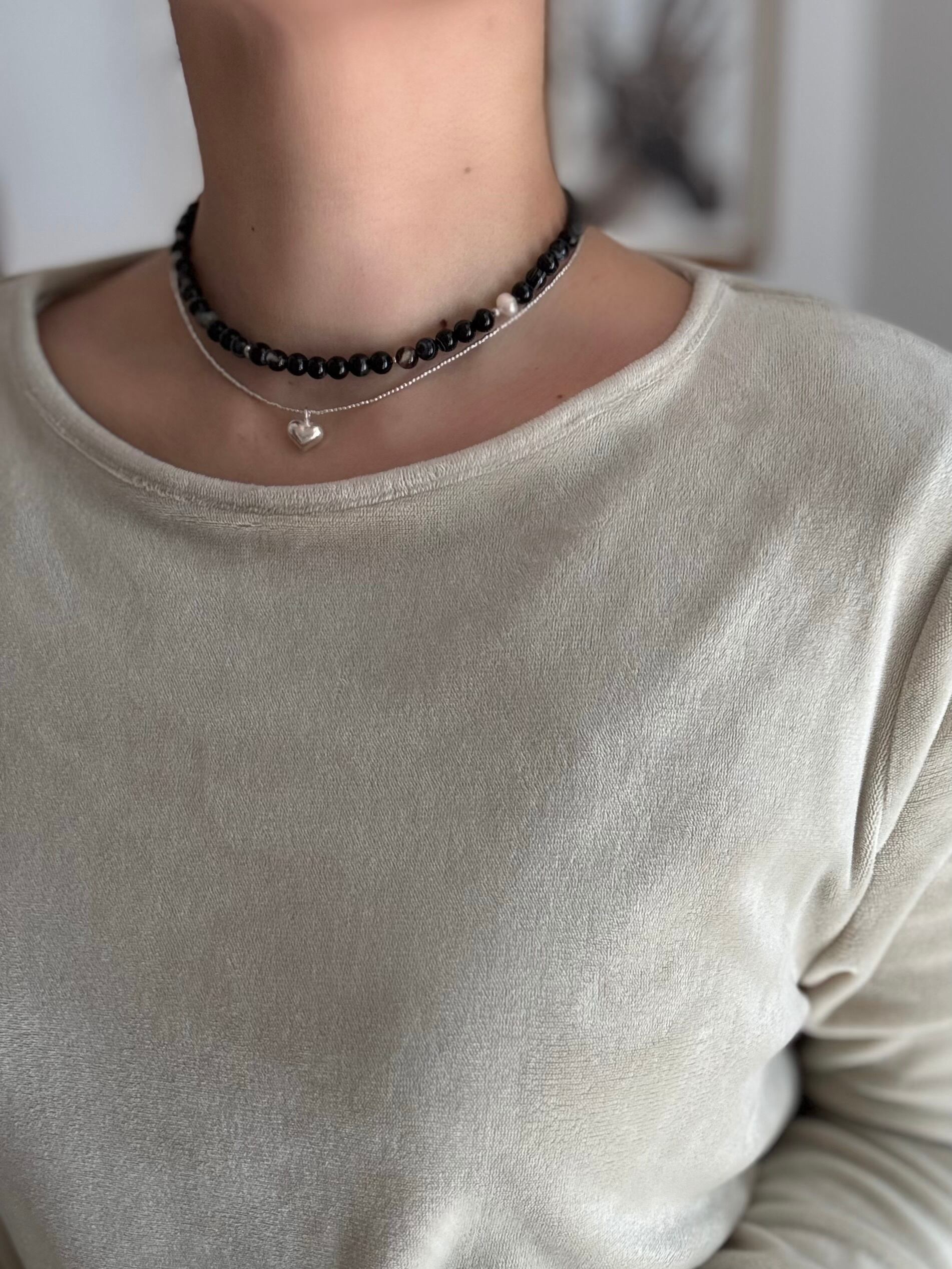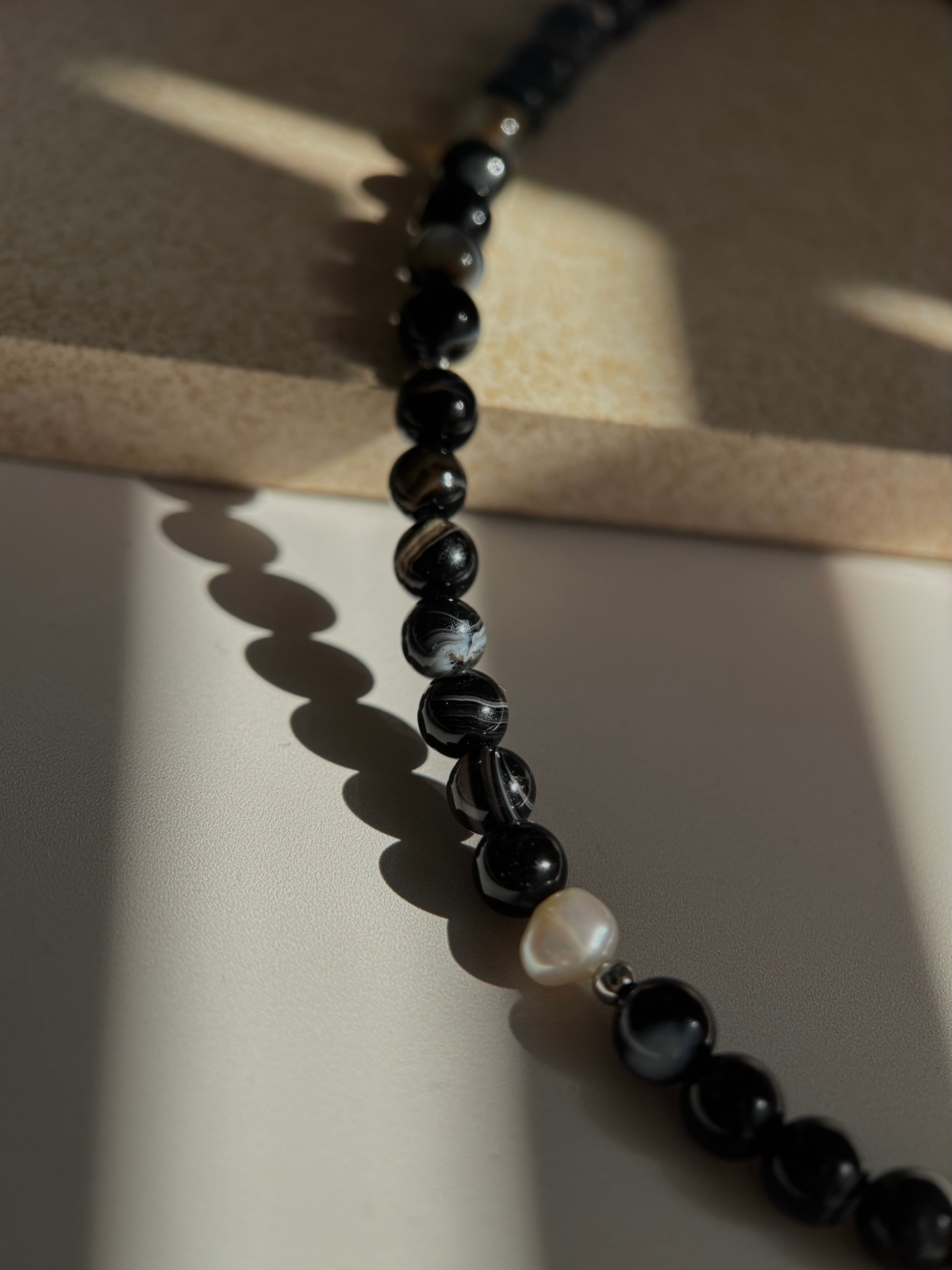 艶やかな黒玉の中に縞や青白い模様、茶系のクリアな玉が時折混ざるバンデットアゲート。